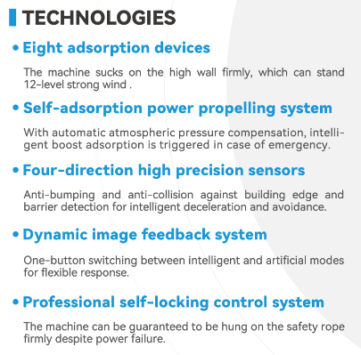 Eight adsorption devices: Firmly attaches to high walls, withstanding level-12 winds.